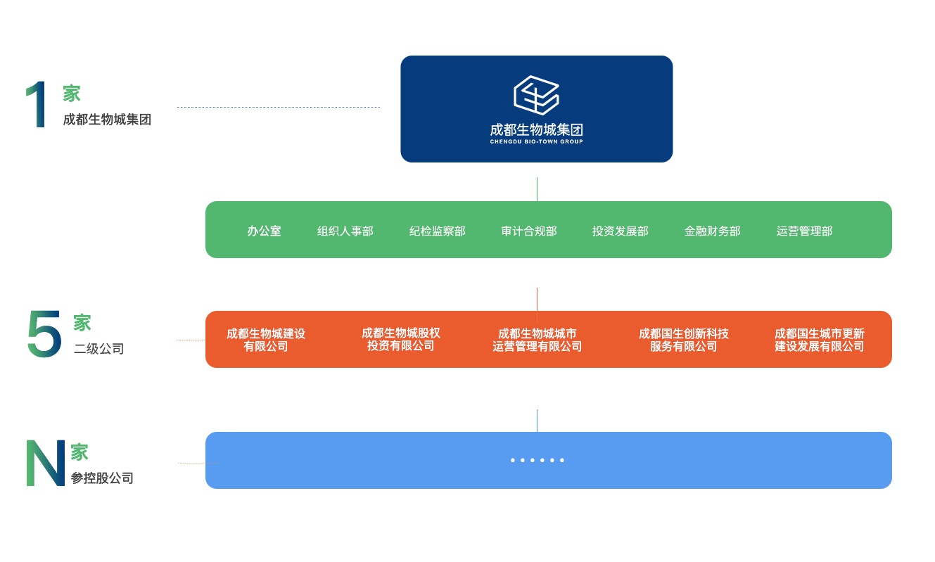 目前,集團(tuán)按照“1+5+N”三級(jí)架構(gòu)下設(shè)5個(gè)二級(jí)子公司,成都生物城建設(shè)有限公司、成都生物城股權(quán)投資有限公司、成都生物城城市運(yùn)營管理有限公司、成都國生創(chuàng)新科技服務(wù)有限公司、成都國生城市更新建設(shè)發(fā)展有限公司。在三級(jí)公司積極推進(jìn)國企混改,引入社會(huì)優(yōu)質(zhì)戰(zhàn)略投資者,與中石油、格力、國藥、華西等行業(yè)龍頭成立合資企業(yè)10家,參股成都威斯克生物醫(yī)藥有限公司、成都海楓生物科技有限公司、成都天府國際生物城供應(yīng)鏈服務(wù)有限公司等企業(yè)。集團(tuán)資產(chǎn)規(guī)模超300億元,已獲得AAA主體信用評(píng)級(jí),通過ISO9001質(zhì)量管理體系認(rèn)證、ISO14001環(huán)境管理體系認(rèn)證、OHSAS18001健康安全管理體系認(rèn)證,并獲得ISO37301:2021及GB/T35770-2022合規(guī)管理體系雙認(rèn)證。