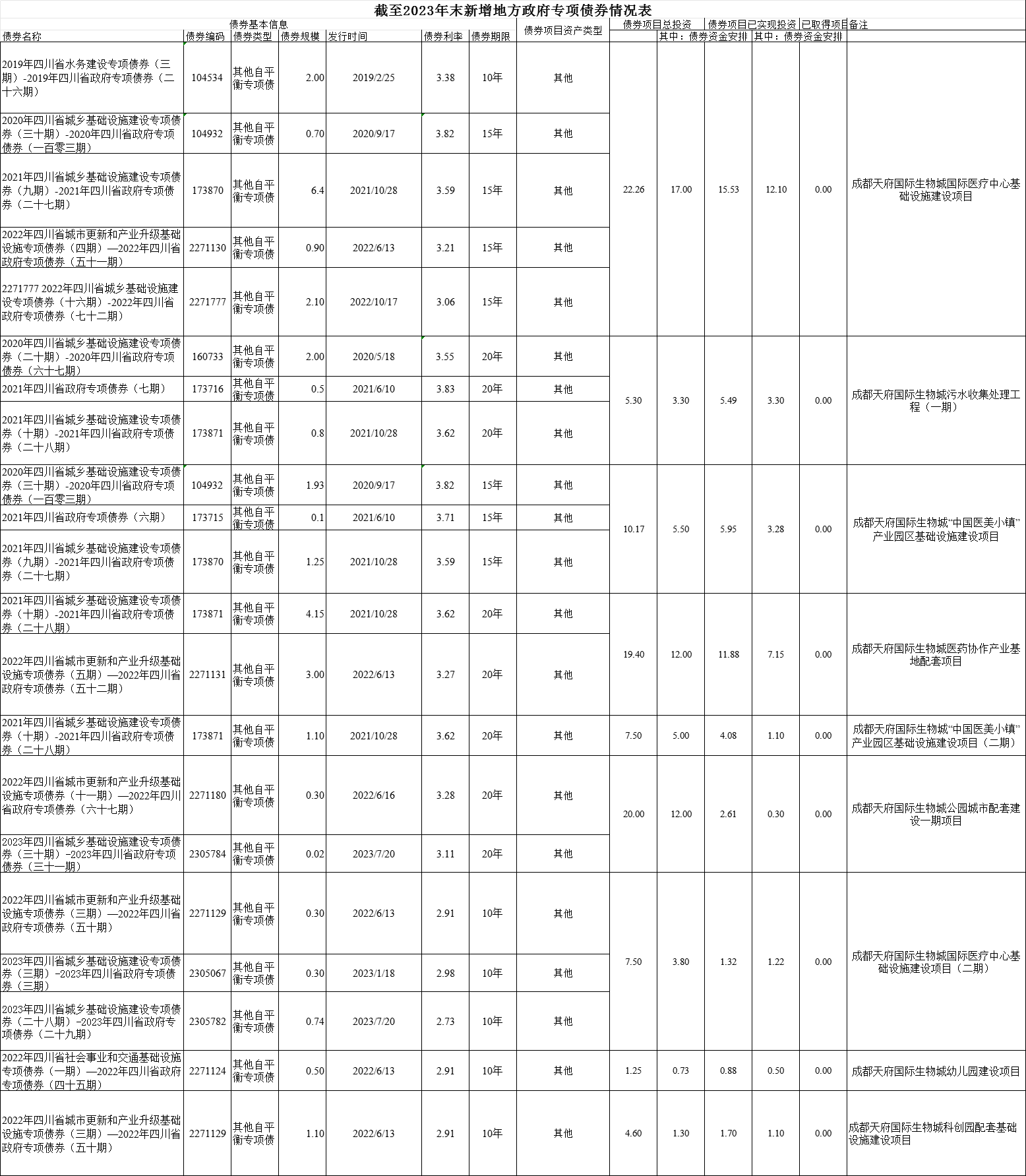 2023年成都天府國際生物城發(fā)展集團(tuán)有限公司新增地方政府專項(xiàng)債券情況